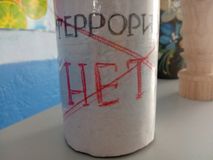 Ребята нарисовали рисунки, символизирующие мир во всём мире, которые поместили в стеклянную бутылку с надписью "Терроризму НЕТ"