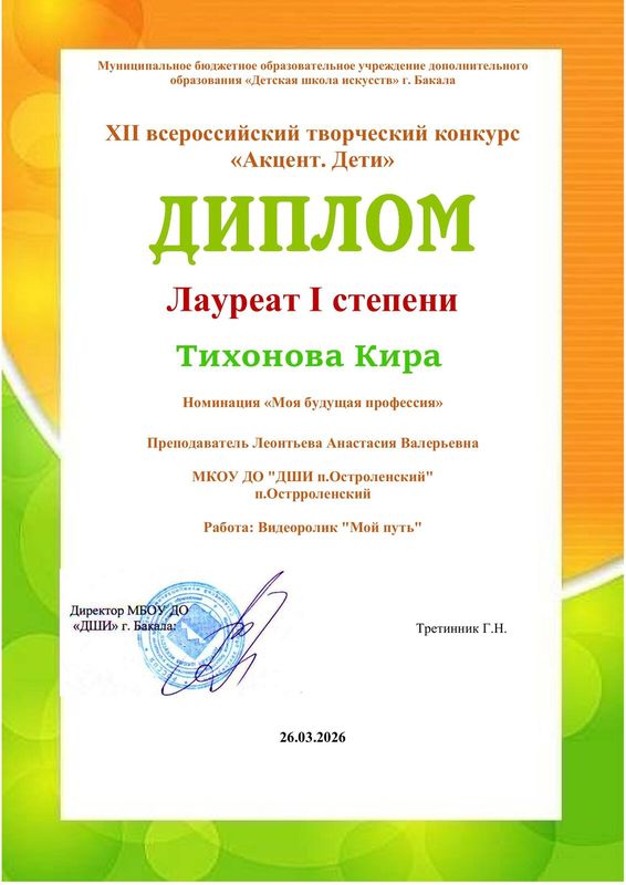 В номинации «Моя будущая профессия» так же принимала участие Тихонова Кира , где на суд жюри был представлен видеоролик "Мой путь", по результатам конкурса награждена дипломом Лауреата 1 степени.