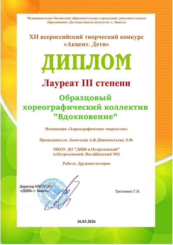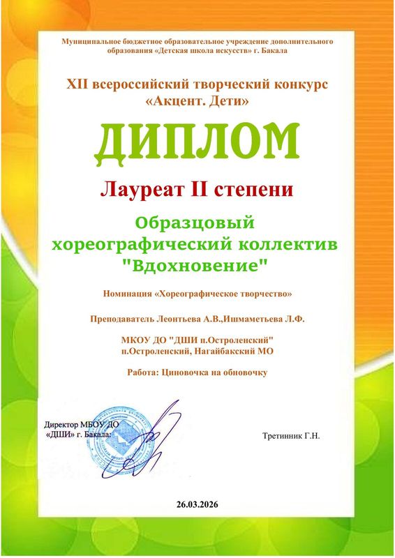На суд жюри в номинации «Хореография» были представлены две постановки: «Дружная история» (младшая группа); народно-сценический танец «Циновочка на обновочку» (средняя группа). Коллектив достойно оценен членами жюри, в результате которого номер младшей группы отмечен дипломом Лауреата 3 степени, номер средней группы отмечен дипломом Лауреата 2 степени.