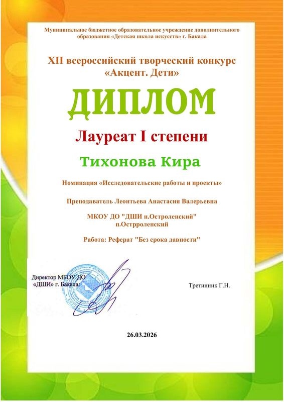 В номинации «Исследовательские работы и проекты» приняла участие Тихонова Кира с конкурсной работой "Без срока давности". По итогам конкурса работа отмечена дипломом Лауреата 1 степени.